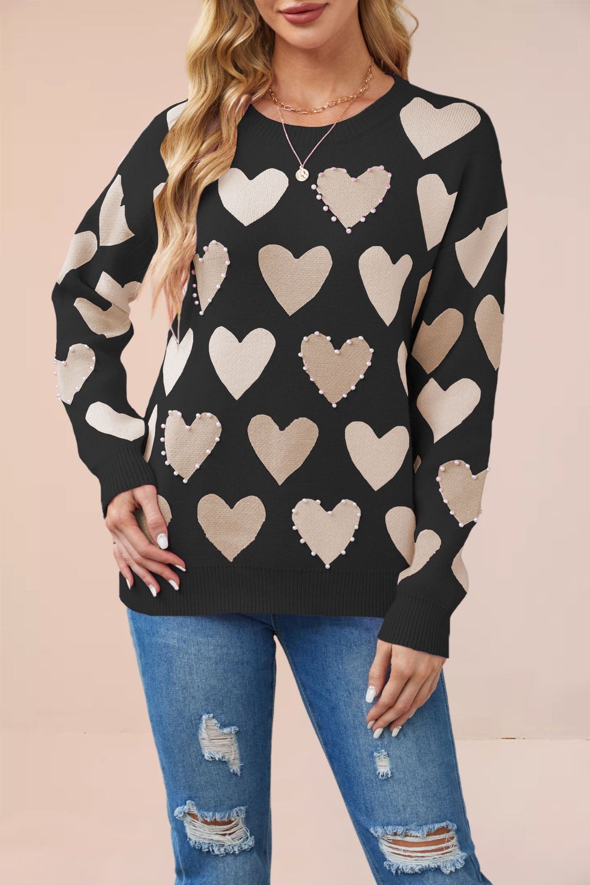 2025 AutumnWinter Beaded Heart Knit Sweater - Classic Black / Extra Large